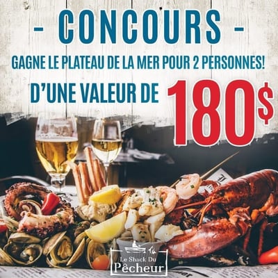Que diriez-vous de partager un délicieux plateau de fruits de mer avec une personne spéciale ? Le Shack Du Pêcheur vous propose une occasion en or de remporter un somptueux plateau de la mer pour deux personnes. 🌊🦐