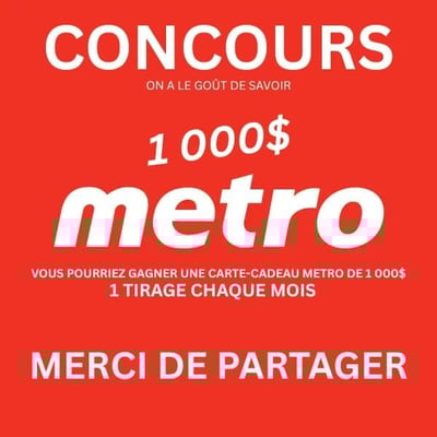 Chaque mois, un heureux gagnant recevra une carte-cadeau METRO d'une valeur de 1 000 $, utilisable dans les magasins Metro, Metro Plus, Super C ou 5 saisons participants au Québec.