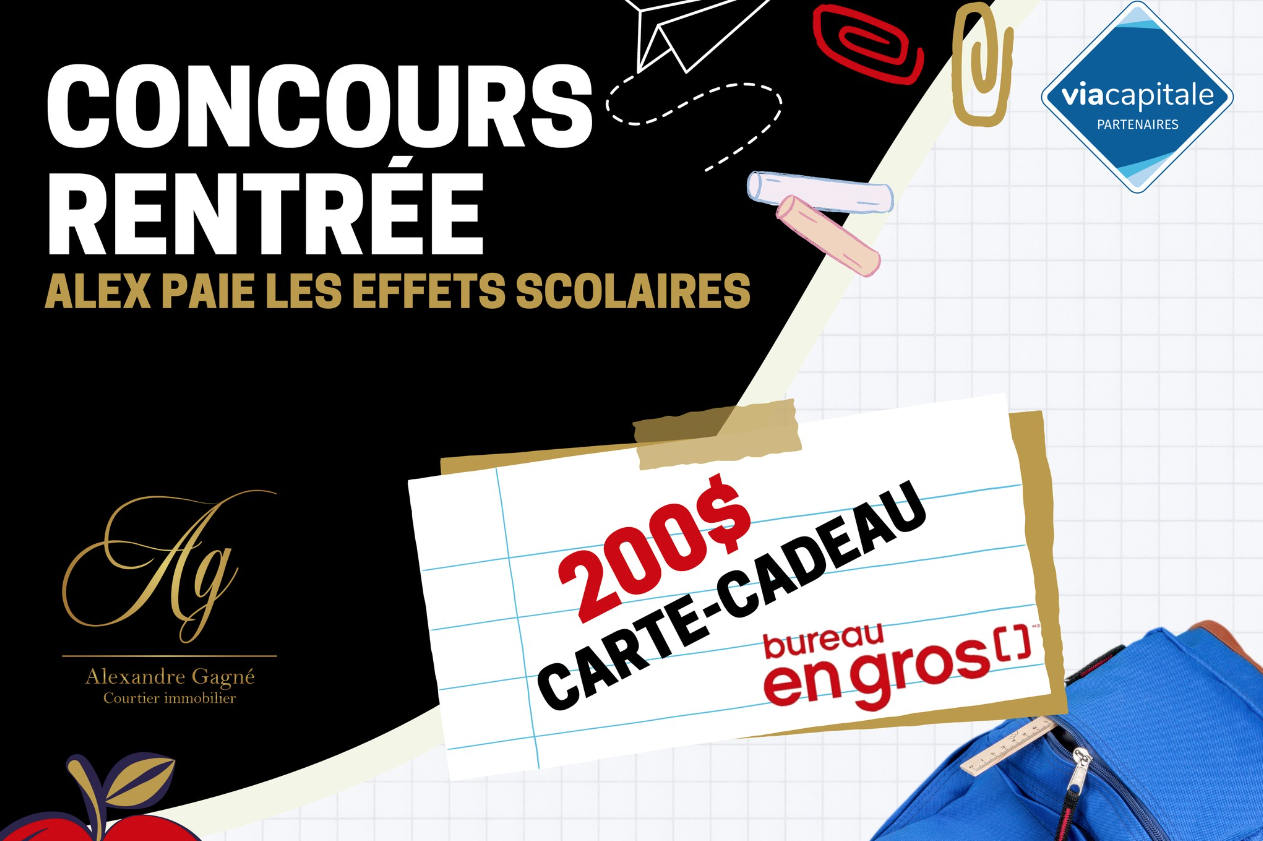 La page « Alexandre Gagné – Via Capitale » propose un prix séduisant : Une carte-cadeau d'une valeur de 200 dollars à utiliser chez Bureau en Gros. Un unique gagnant aura la chance de remporter ce prix. Ce cadeau vous permettrait de vous procurer tout ce dont vous avez besoin pour la rentrée scolaire.