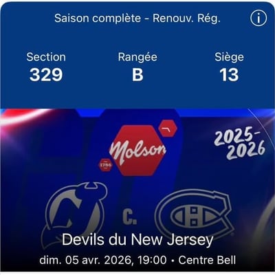 - Deux billets pour le match des Canadiens le 5 avril 2026