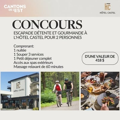 Prêt pour une pause bien méritée ? Participez à notre concours et tentez de gagner une expérience inoubliable à l'hôtel Castel de Granby. Laissez-vous choyer par un séjour qui allie détente et gastronomie, dans un cadre enchanteur.