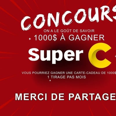 En participant, vous courez la chance de remporter une carte-cadeau d'une valeur incroyable de 1000$ à utiliser chez Super C. Imaginez ce que vous pourriez acheter : des produits frais, des gourmandises, et bien plus encore ! 🛒