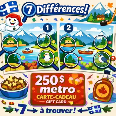 Si vous aimez les jeux d’observation et les petites compétitions, ce jeu va vous plaire ! Sur Québec Rabais Gratuits, un nouveau concours vous met au défi de trouver les 7 différences entre deux images presque identiques. Et le meilleur ? Chaque jour, un participant chanceux peut remporter une carte-cadeau Métro de 250 $. Oui, vous avez bien lu, 250 $ !